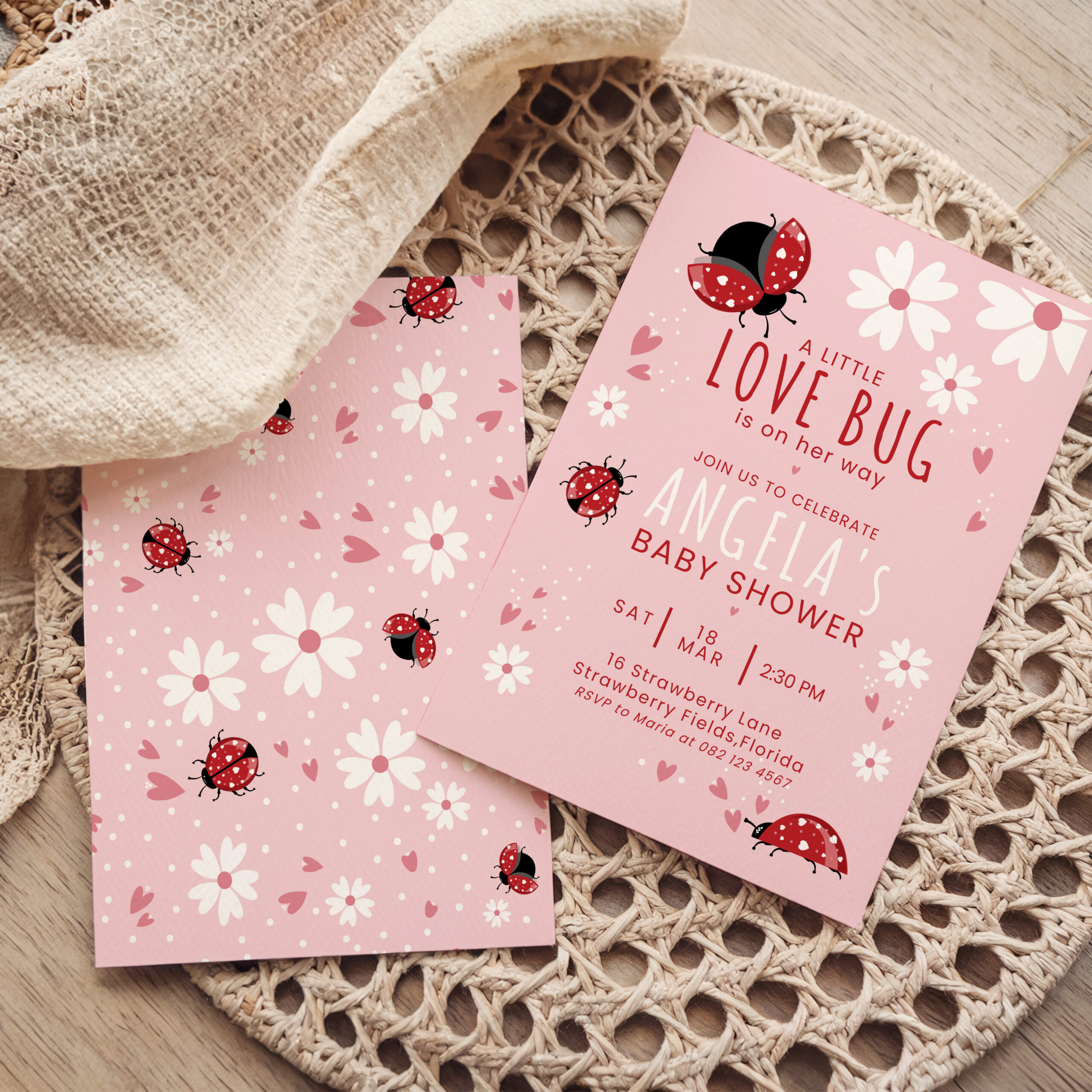 Create a buzz around  your “little love bug’s” upcoming arrival with this charming and customizable baby shower invitation. Our Editable pink lady bug themed invitation is  perfect for a sweet and memorable celebration. This double sided digital invitation template is an instant download, allowing you to personalize and print with ease.