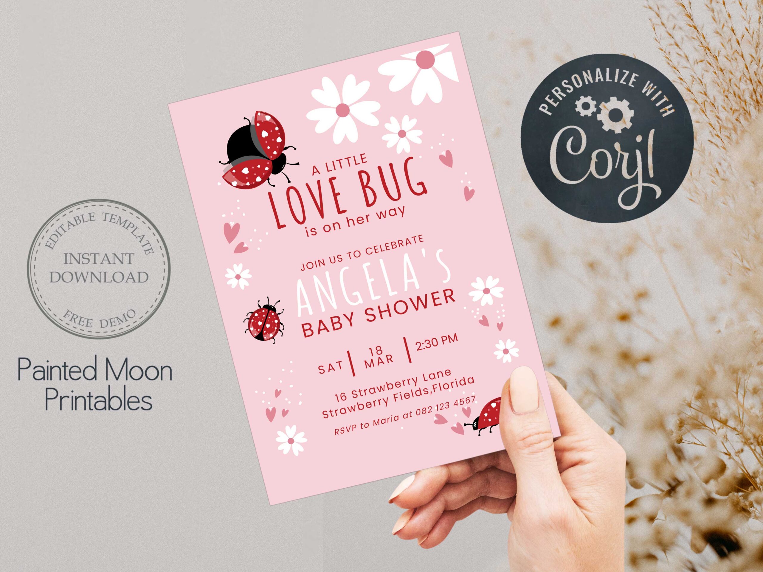 Editable Love Bug Baby Shower Invitation – Pink Lady Bug Themed Digital Corjl Template Printable 5″ x7″