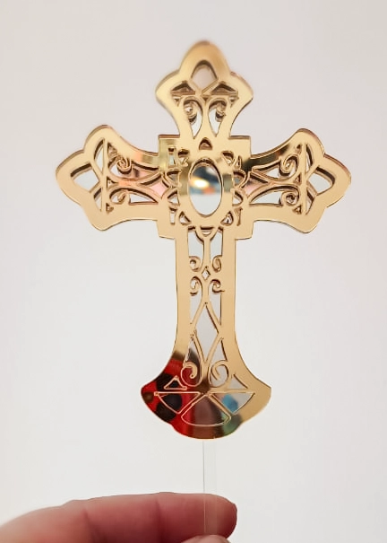 This little filigree cross is a tiny, laser-cut masterpiece. A detailed filigree pattern layered onto a bright silver mirror base. It’s a cake jewel—three-dimensional, super sparkly, and luxurious.12 cm in height with a 10 cm stem.