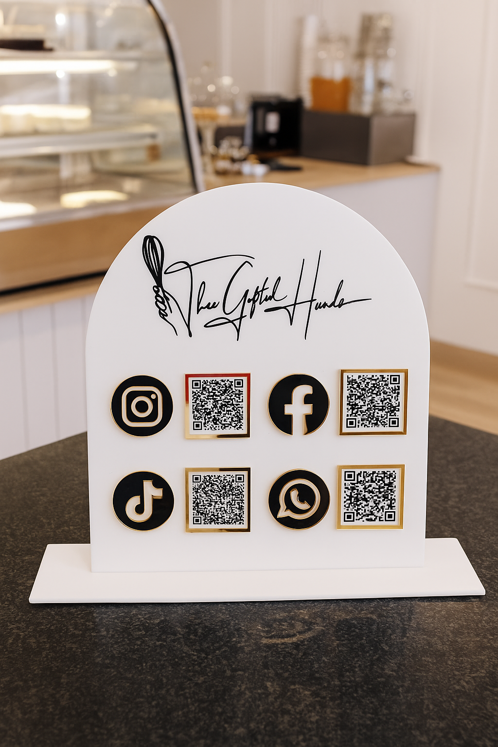 A MUST HAVE for today’s businesses . Direct your clients to your online sites with our custom acrylic social media signs. Easily drive traffic to your platforms with scanable qr codes. These stylish and professional it is perfect for shops, offices, and events. Order now to grow your brand. Made from 3mm acrylic , they come in a clear,white or black acrylic back & stand . Choose from gold , silver or rose acrylic mirror icons .The sign size is 220 x 200mm